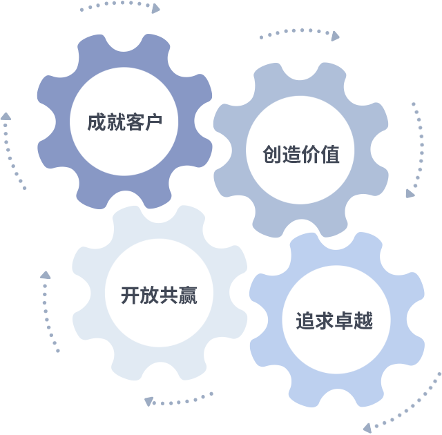 成就客户是一切决策的出发点,创造价值是衡量所有工作的标准,追求卓越是151amjs澳金沙门做事做人的态度,开放共赢是151amjs澳金沙门的格局也是最终的结果。价值观的齿轮环环相扣,推动着组织里的每个人不断向前。